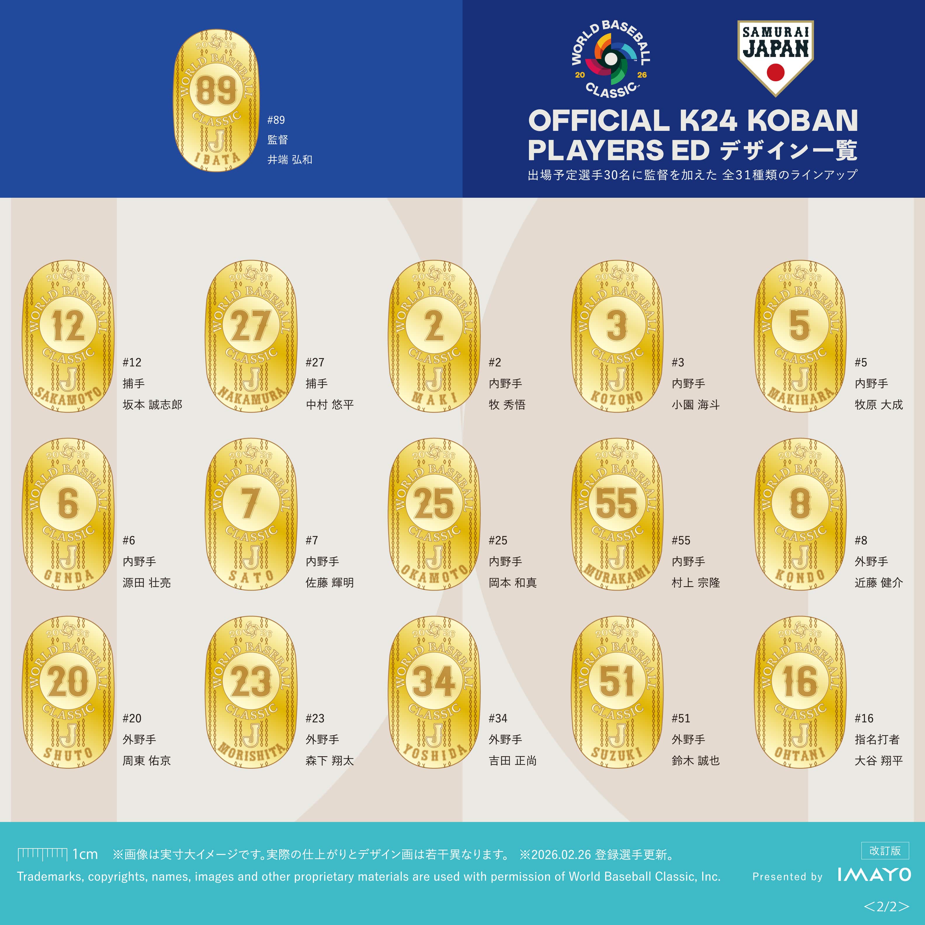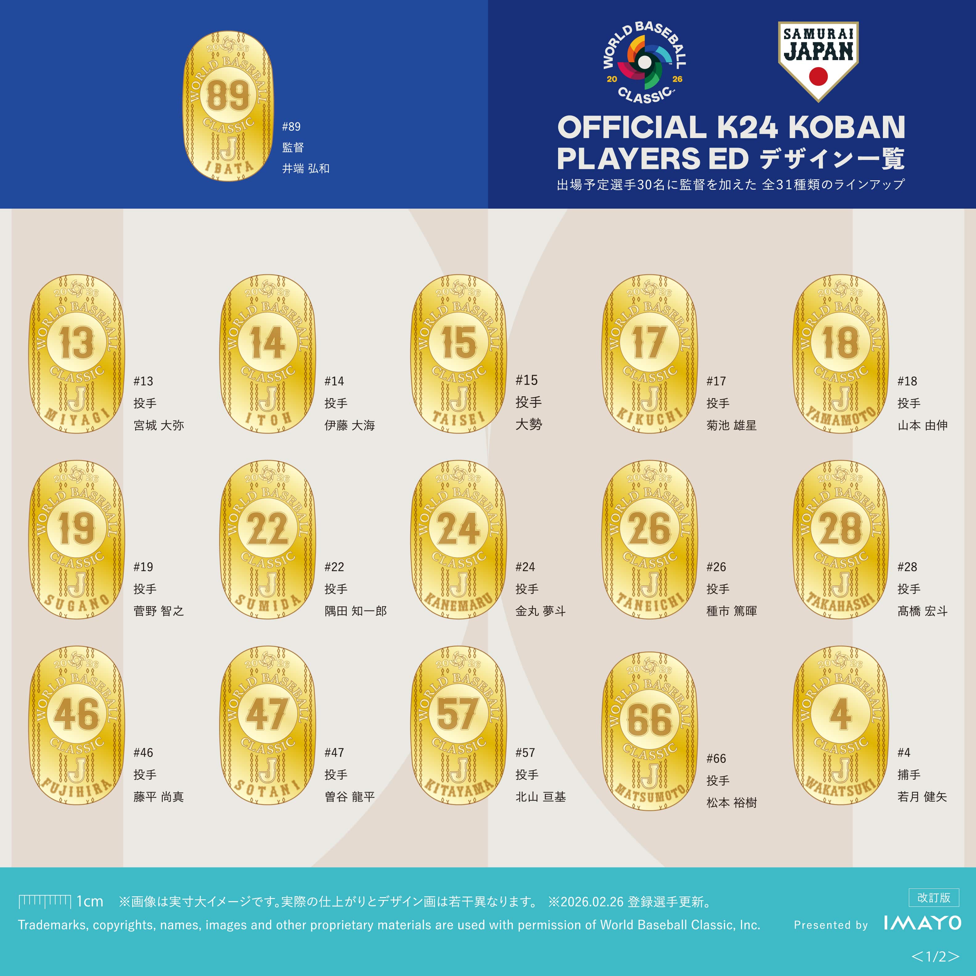 大谷翔平選手や山本由伸選手をはじめとする出場予定選手30名と、井端弘和監督を合わせた全31種類の中から、お好きな1点をお選びいただけます。