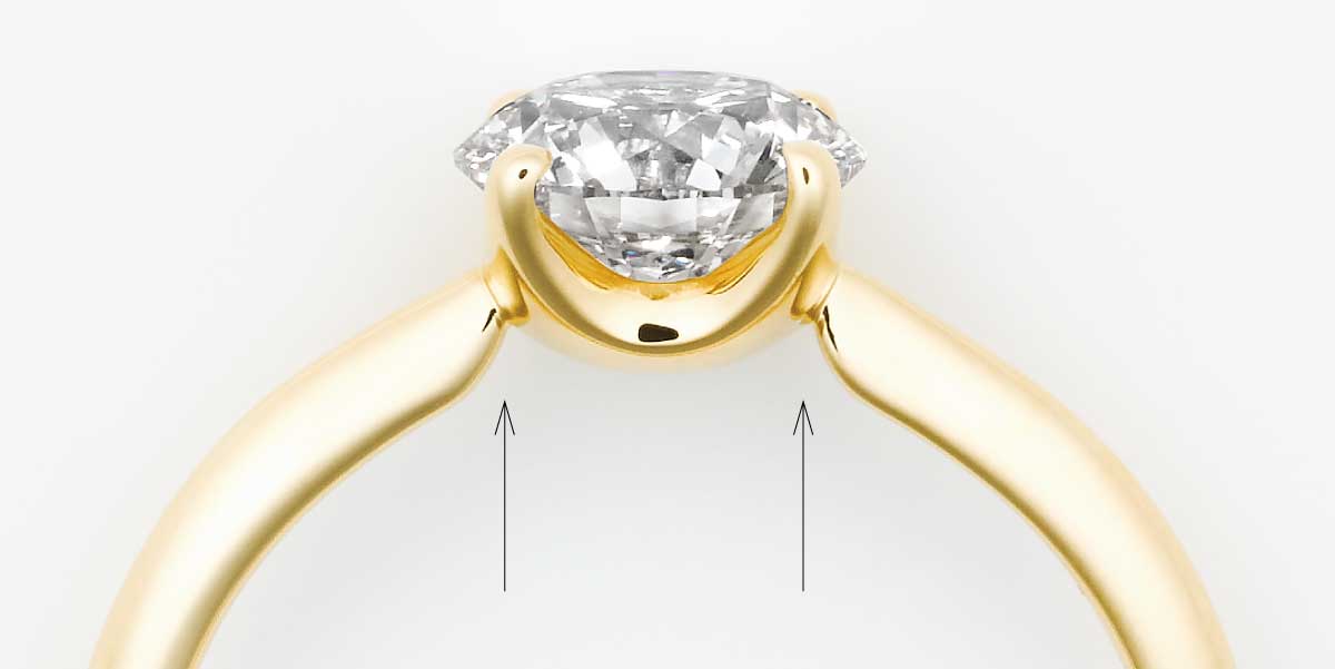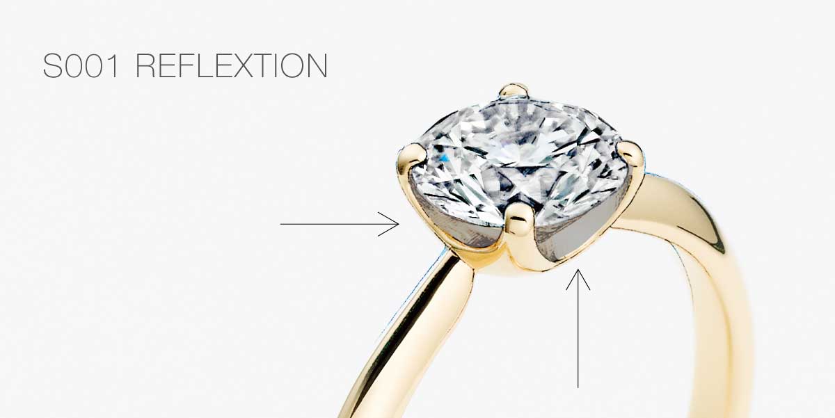 SHINCAのマスターピース S001はラボグロウンダイヤモンドの美しさを最大限に引き立てるため、爪から爪にかけてU字を描く部分に「リフレクション(照り返し)」を施しています。この技術が施されているため、ラボグロウンダイヤモンドは、あらゆる角度から光を取り込みます。さらにこの「リフレクション」は強度を保ちながらも、ソリッドでエッジの効いたデザインに。それはまさに技術とデザインが融合したSHINCAの象徴です。